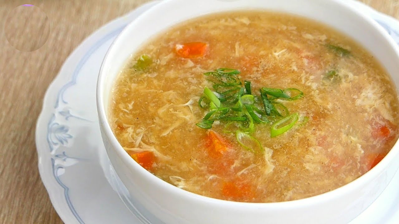 মাংস সেদ্ধ হয়ে এলে নামিয়ে একটা প্লেটে মাংস এবং চিকেন স্টক আলাদা করে রাখতে হবে তারপর মাংস টাকে ঠান্ডা করে চামচের সাহায্যে ছোট ছোট পিস করে নিতে হবে।অন্যদিকে ফ্রাইং প্যানে মাখন গরম করে কাট করা পেঁয়াজ দিয়ে হালকা ভেজে আদা ও রসুন বাটা দিয়ে হালকা বাদামি করে ভেজে নিতে হবে কাঁচা গন্ধ চলে যাওয়া পর্যন্ত আর এই সময় গ্যাসের আঁচ মাঝারি রাখতে হবে,ভালো করে ভাজা হয়ে গেলে গ্রেট করা গাজর এবং পেঁয়াজ শাক দিয়ে হালকা ভেজে নিতে হবে 1 থেকে 2 মিনিট,দু মিনিট পর তাকে চিকেন দিয়ে আবারও হালকা নেড়ে নিয়ে চিকেন স্টক ঢেলে দিতে হবে এবং নেড়ে 5 থেকে 7 মিনিট ফুটিয়ে নিতে হবে মাঝারি আঁচে,7 মিনিট পর তাতে একে একে ভিনিগার, সয়া সস, স্বাদমতো নুন এবং টমেটো সস দিতে হবে| তারপর আবারও ভালো করে মিশিয়ে নিতে হবে এবং আরও তিন থেকে চার মিনিট ফুটিয়ে দিতে হবে,3/4 মিনিট পর পুরোপুরি ফুটে গেলে তাতে কর্নফ্লাওয়ারের গোলা দিয়ে ভালো করে মিশিয়ে এক থেকে দু মিনিট নেড়ে নিয়ে ডিমের গোলা অল্প অল্প করে দিয়ে সমস্তটা ভালো করে মিশিয়ে নিতে হবে এবং রান্না করে নিতে হবে আরও তিন থেকে চার মিনিট,সবশেষে স্যুপ পুরোপুরি হয়ে গেলে গোলমরিচ গুঁড়ো ছড়িয়ে ভালো করে মিশিয়ে নামিয়ে নিতে হবে